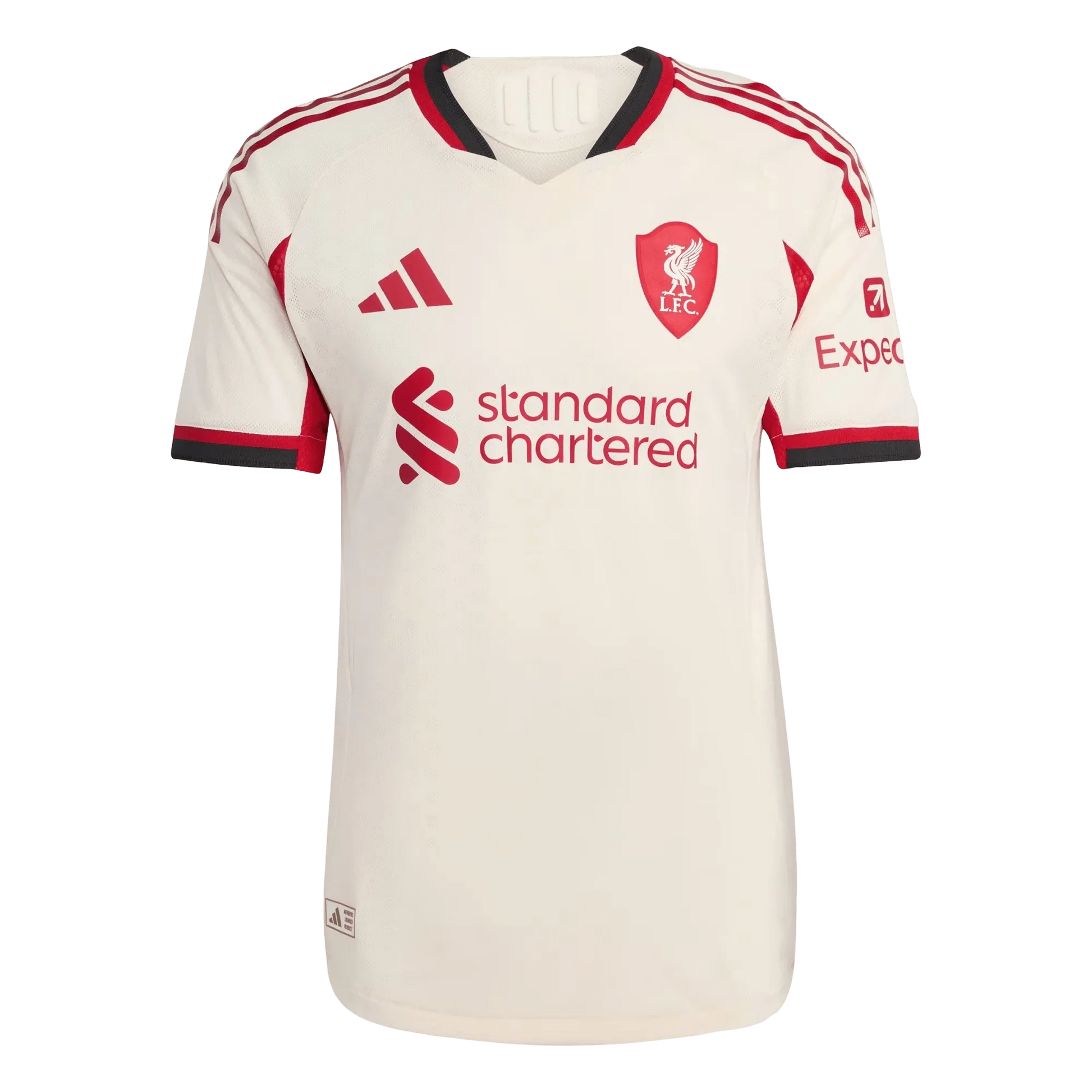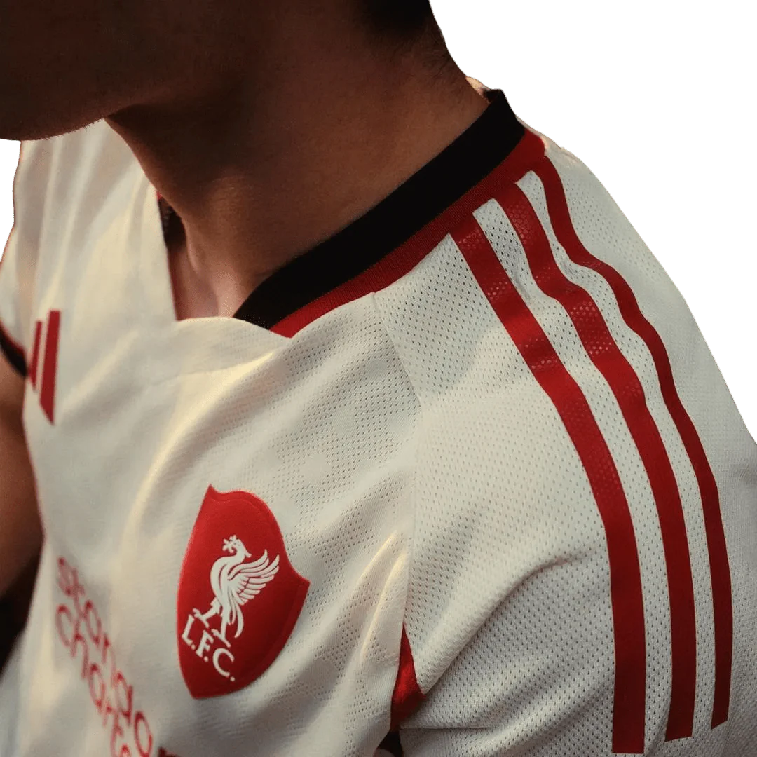 There's something really refreshing about this Liverpool Away Kit 2025/26 that immediately catches your eye when you see it displayed properly. The Wonder White base color has this clean, almost creamy off-white tone that feels both classic and contemporary at the same time – it's not stark white, but this really sophisticated shade that somehow manages to look both timeless and modern. What really stands out is how the red accents on the collar and sleeve details create this perfect contrast without being overwhelming. The Standard Chartered logo sits beautifully across the chest in that familiar red, while the shielded Liver Bird crest adds such a distinctive touch that you don't see on other liverpool jersey designs. This represents Arne Slot's first season, and you can tell there's been real thought put into creating something that honors Liverpool's heritage while looking confidently toward the future at Goatkits Store.
