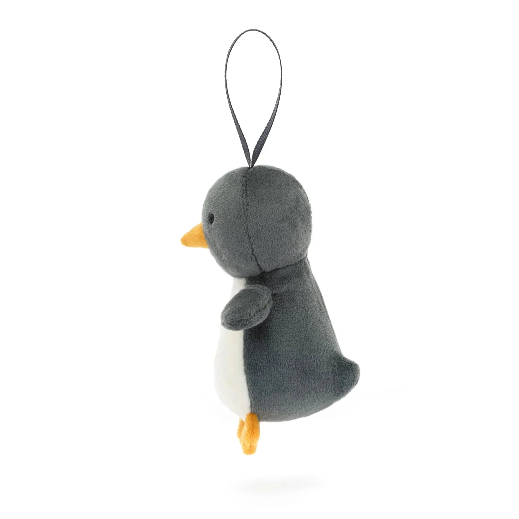 Festive Folly Penguin is a blue-grey charmer, with a buttercream tummy and tiny flippers. This chilly pal has orange suedette beak and feet, embroidered eyes and a slate grosgrain ribbon for hanging to the tree. A stocking filler for polar pal lovers!